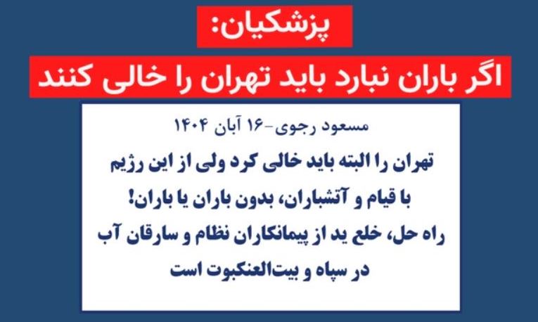 مسعود رجوی-۱۶ آبان ۱۴۰۴ – تهران را البته باید خالی کرد ولی از این رژیم با قیام و آتشباران، بدون باران یا باران! راه حل، خلع ید از پیمانکاران نظام و سارقان آب