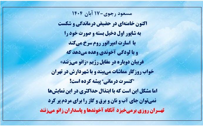 مسعود رجوی-۱۷ آبان ۱۴۰۴ اکنون خامنهای در حضیض درماندگی و شکست به شاپور اول دخیل بسته
