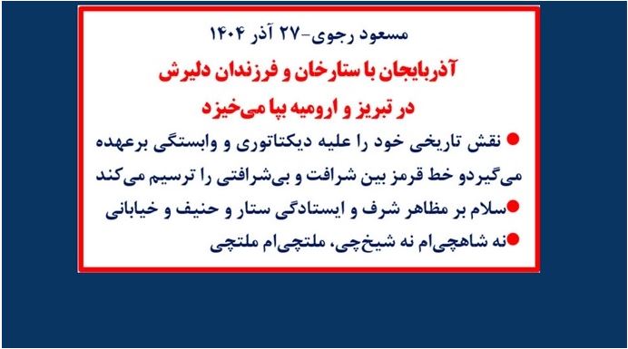 مسعود رجوی-۲۷ آذر ۱۴۰۴ آذربایجان با ستارخان و فرزندان دلیرش در تبریز و ارومیه بپا میخیزد