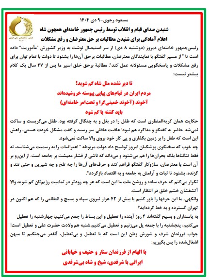 مسعود رجوی-۹ دی ۱۴۰۴ شنیدن صدای قیام و انقلاب توسط رئیس جمهور خامنه‌ای همچون شاه اعلام آمادگی برای شنیدن مطالبات بر حق معترضان و رفع مشکلات
