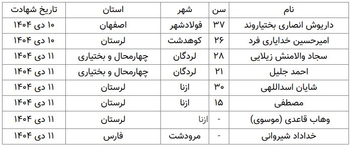 سازمان مجاهدین خلق ایران ظهر امروز ۱۲ دی، اسامی ۸ تن از شهیدان قیام سراسری مردم ایران علیه فاشیسیم مذهبی حاکم بر ایران را که در روزهای ۱۰ و ۱۱ دی ۱۴۰۴ در شهرهای فولادشهر، کوهدشت، لردگان، ازنا و مرودشت به دست پاسداران و نیروهای سرکوبگر خامنهای به شهادت رسیدند، منتشر کرد. یکی از شهیدان یک نوجوان ۱۵ ساله در شهر ازنا است. جان باختن این ۸ تن از طریق منابع معتبر راستیآزمایی شده است. اسامی و مشخصات شمار دیگری از شهیدان نیز در دست بررسی است که پس از تأیید نهایی منتشر خواهد شد.