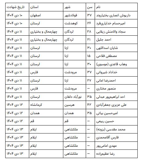 سازمان مجاهدین خلق ایران، اسامی ۱۰ تن دیگر از شهیدان قیام سراسری مردم که جان بر سر آزادی گذاشتند را منتشر میکند. باین ترتیب تا کنون اسامی ۱۸ تن از شهیدان سرفراز قیام منتشر شده است. روز شنبه ۱۳ دی ماه پاسداران جنایتکار در یک جنایت سبعانه به روی نظاهرکنندگان در ملکشاهی ایلام رگبار گشودند که منجر به شهادت و مجروح شدن شمار زیادی از مردم بیدفاع و بیگناه شد. اسامی چهارتن از این شهیدان تاکنون مشخص شده است. گزارشها حاکی از کمبود خون برای مجروحان در بیمارستان ملکشاهی است.