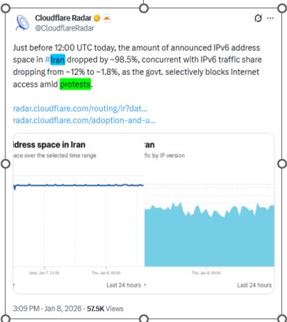 گزارش رادار کلاودفلر (Cloudflare Radar): این سند گرافیکی نشان میدهد که درست پیش از ساعت ۱۳:۰۰، ترافیک پروتکل IPv6 با سقوطی ۹۸.۵ درصدی از ۱۲ درصد به ۱.۸ درصد کاهش یافته است. این آمار فنی اثبات میکند که قطع اینترنت ناشی از نقص فنی نبوده، بلکه حاصل «مسدودسازی مهندسیشده» و عمدی توسط رژیم برای ایزوله کردن مردم و سرپوش گذاشتن بر سرکوب است.