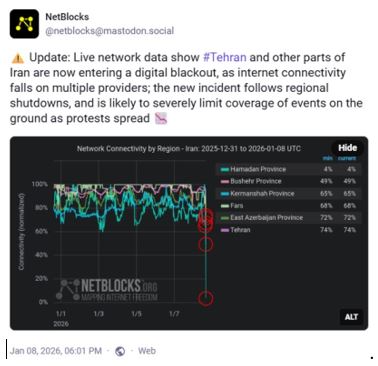 دیدبان اینترنت «نتبلاکس» (NetBlocks) صبح امروز ۸ ژانویه ۲۰۲۶ با انتشار نمودار گرافیکی وضعیت شبکه، رسماً تأیید کرد که «تهران و سایر نقاط ایران وارد خاموشی دیجیتال شدهاند» و سطح دسترسی به اینترنت به ۵ درصد سقوط کرده است.