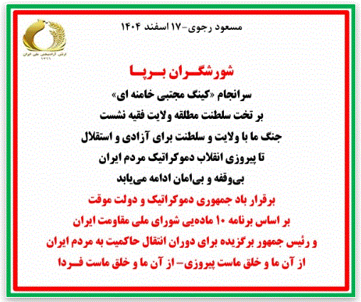 مسعود رجوی-۱۷ اسفند ۱۴۰۴ شورشگـران بـرپـا سرانجام «کینگ مجتبی خامنه ای» بر تخت سلطنت مطلقه ولایت فقیه نشست جنگ ما با ولایت و سلطنت برای آزادی و استقلال تا پیروزی انقلاب دموکراتیک مردم ایران بیوقفه و بیامان ادامه مییابد برقرار باد جمهوری دموکراتیک و دولت موقت بر اساس برنامه ۱۰ مادهیی شورای ملی مقاومت ایران و رئیس جمهور برگزیده برای دوران انتقال حاکمیت به مردم ایران از آن ما و خلق ماست پیروزی- از آن ما و خلق ماست فـردا