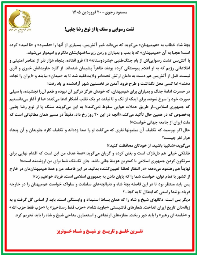 مسعود رجوی – ۲۰ فروردین ۱۴۰۵ – تشت رسوایی و سنگ پا از نوع رضا چلبی!