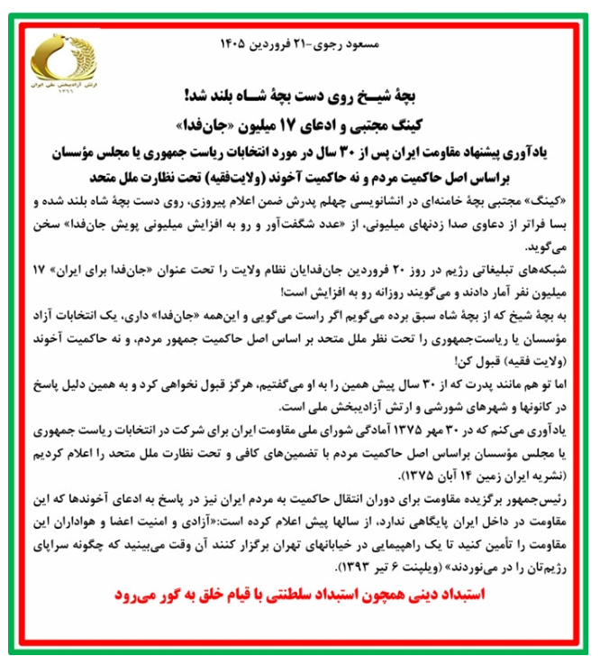 مسعود رجوی-۲۱ فروردین ۱۴۰۵ – بچهٔ شیـخ روی دست بچهٔ شـاه بلند شد! کینگ مجتبی و ادعای ۱۷میلیون «جانفدا»