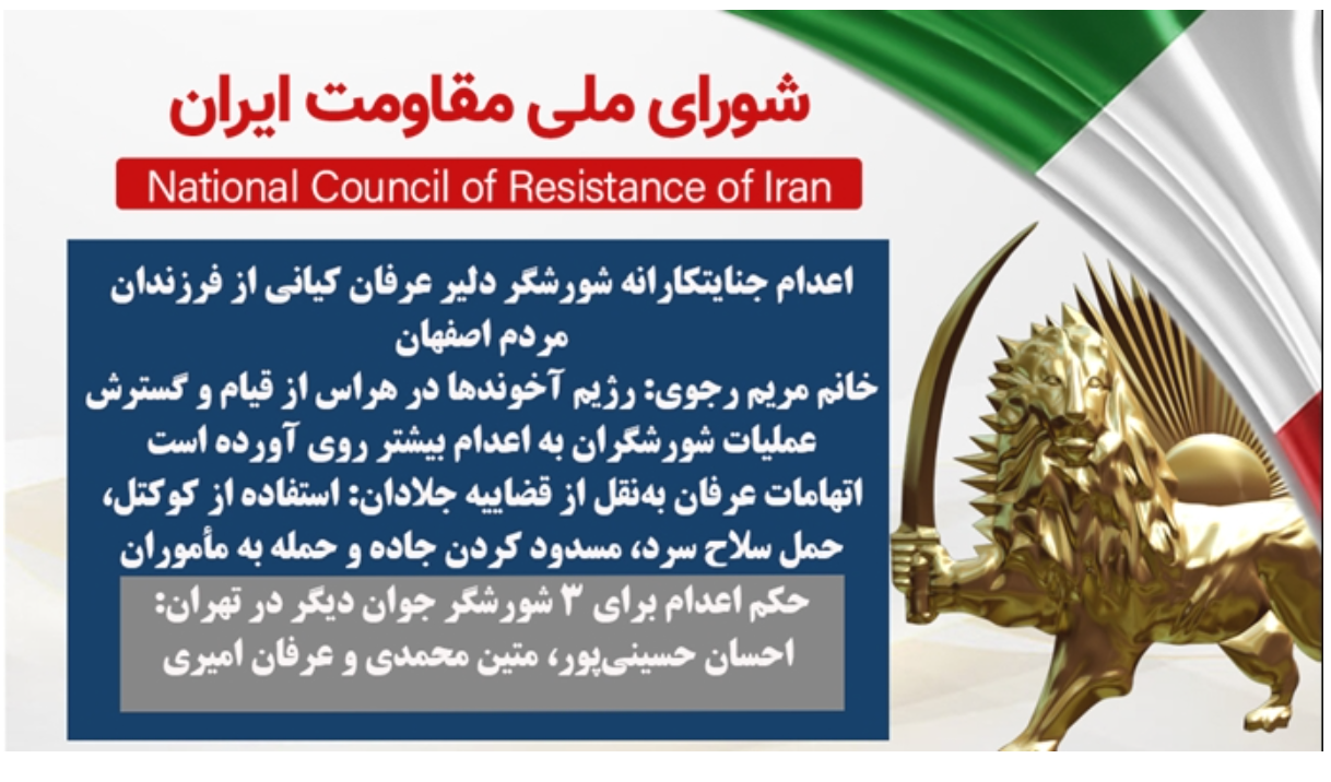 قضایيه جلادان بامداد شنبه ۵ اردیبهشت در یك جنایت سبعانه ديگر شورشگر دلیر عرفان كیانی از فرزندان مردم اصفهان را سربهدار كرد.